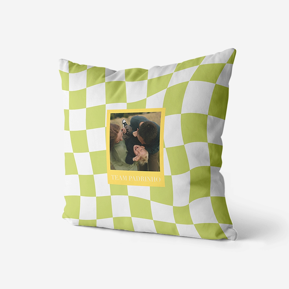 Dá um upgrade ao sofá com este padrão distorcido em verde azeitona. A moldura em amarelo faz a tua foto saltar à vista e transforma uma almofada simples numa peça com imensa pinta. Conforto e design moderno, sem complicações.