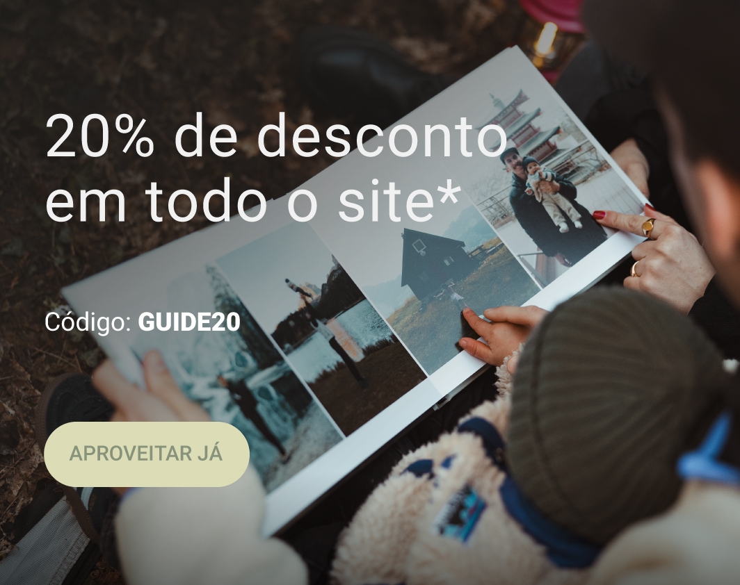 Promoção “The Life Guide” válida de 19 de fevereiro a 19 de março de 2026. O desconto de 20% é aplicado no carrinho mediante a introdução do código GUIDE20. Para garantir a entrega antes do Dia do Pai, as encomendas de Álbuns devem estar pagas até 09/03. Os restantes produtos (Fotos, Presentes e Decoração) até 11/03. Serviço Fotos 24h sujeito a condições específicas de envio. Promoção limitada ao stock existente. Não acumulável com outras promoções ou códigos em vigor.